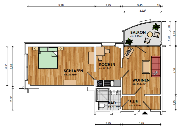 Bad mit Dusche, Balkon, Flur, Kellerraum, Küchenraum