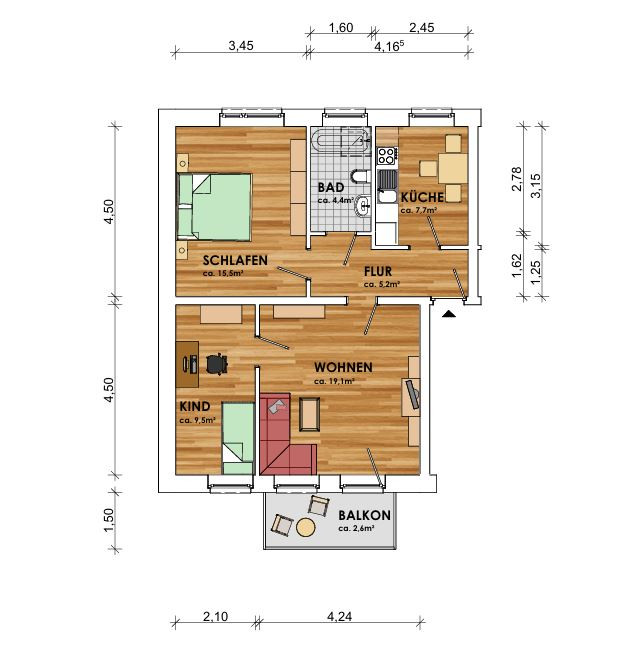 Bad mit Wanne, Balkon, Flur, Kellerraum, Küchenraum