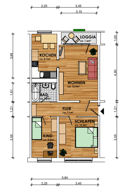 Bad mit Wanne, Flur, Kellerraum, Küchenraum, Loggia